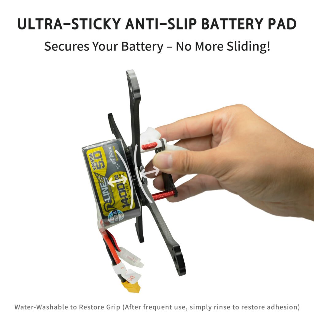 The modern FPV meta demands a Sticky FPV Battery Pad. We aren’t just looking for friction; we are looking for adhesion. We need a material that acts almost like a reusable adhesive, holding the heavy mass of a 6S 1300mAh pack securely against the carbon fiber top plate.
