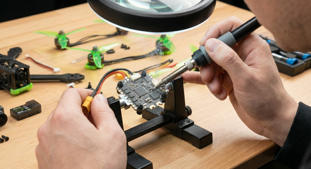 Pro Tip from My Workbench: “Pre-tin” every wire and every pad before you try to join them. Put a blob of solder on the wire, and a blob on the board. Then, just touch them together with the iron. It makes how to build your own racing drone fpv infinitely easier.