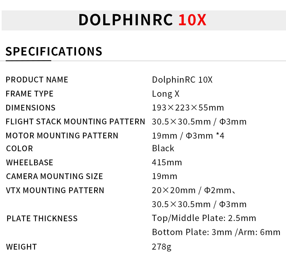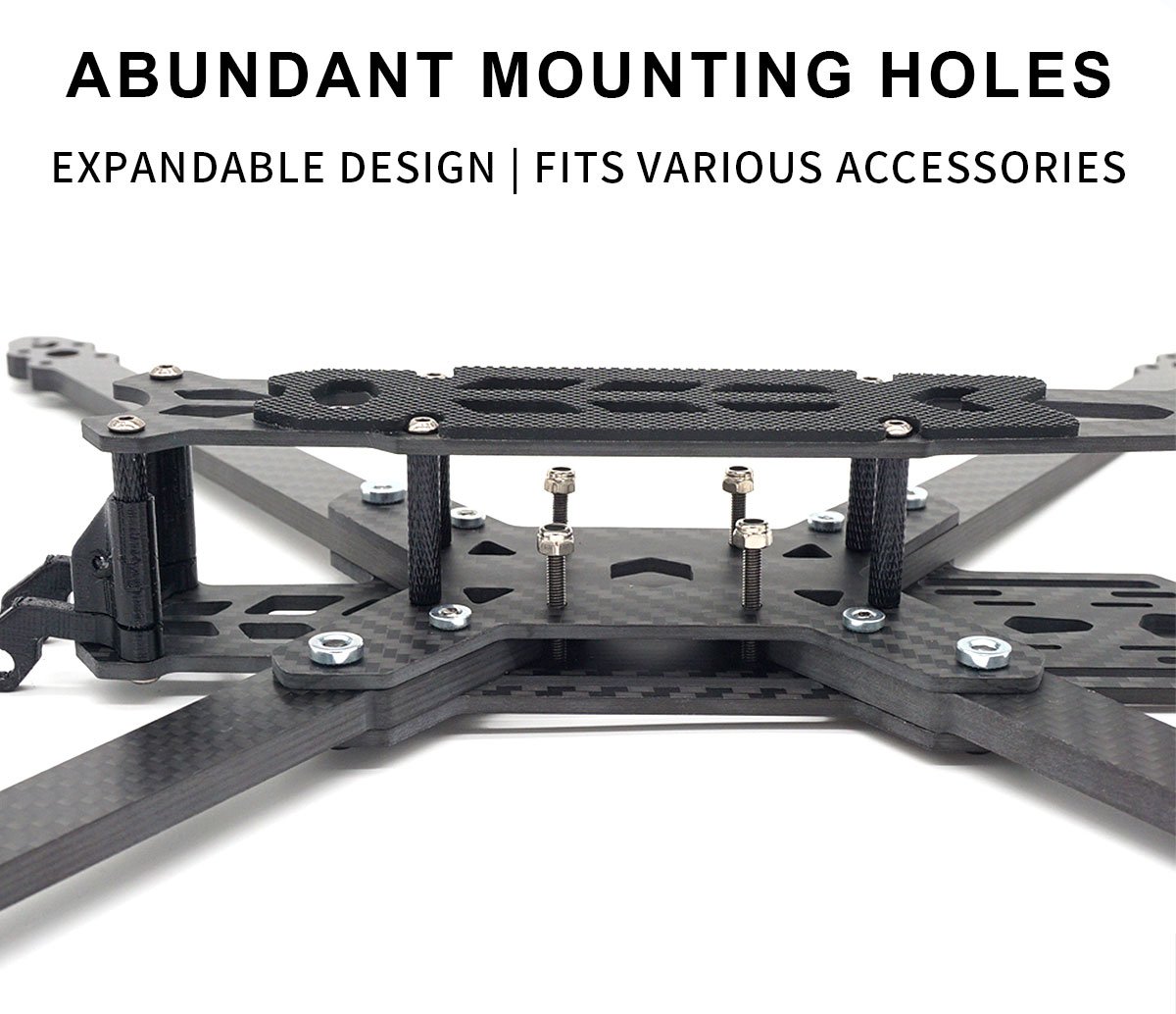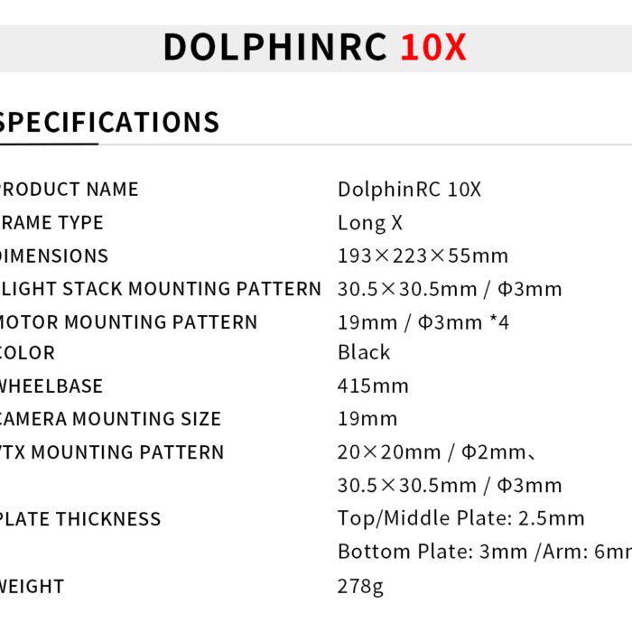 – The motor mounting holes are M3*16/19mm, Dolphin RC 3115 900kv, and 10″ propellers are recommended.