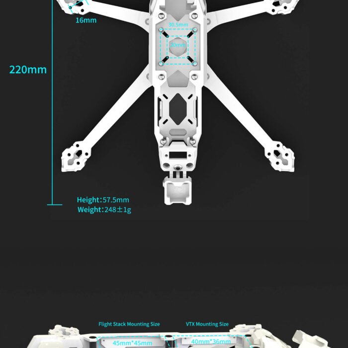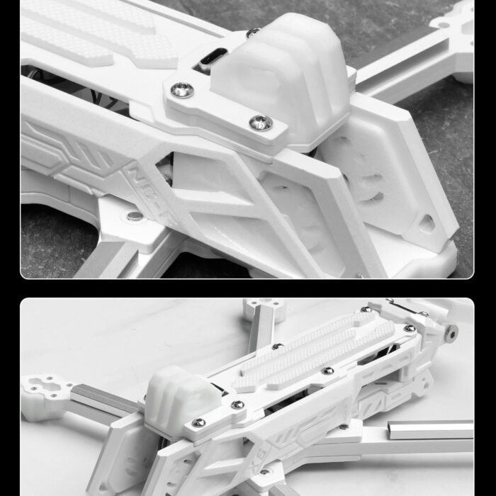 RGB Integration: The frame is a light show out of the box. The white paint reflects the LED colors better than black carbon, making the whole drone glow.